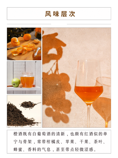 橙酒的经典产区包括弗留利、威尼托部分山地以及西西里岛。代表性葡萄品种涵盖Ribolla Gialla、Friulano、Pinot Grigio、Malvasia等,也有南部的Grecanico与Carricante。其风味兼具白葡萄酒的清新与红葡萄酒的结构感,常带有柑橘皮、苹果干、茶叶、蜂蜜及香料的复杂香气,并带有轻微的涩感。