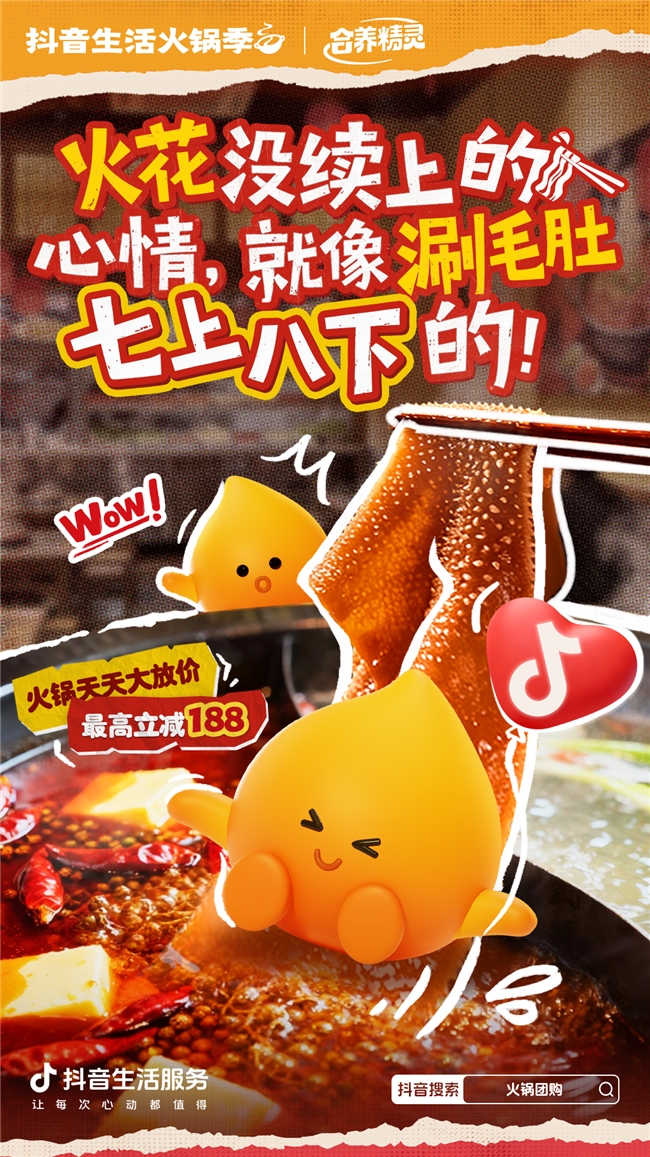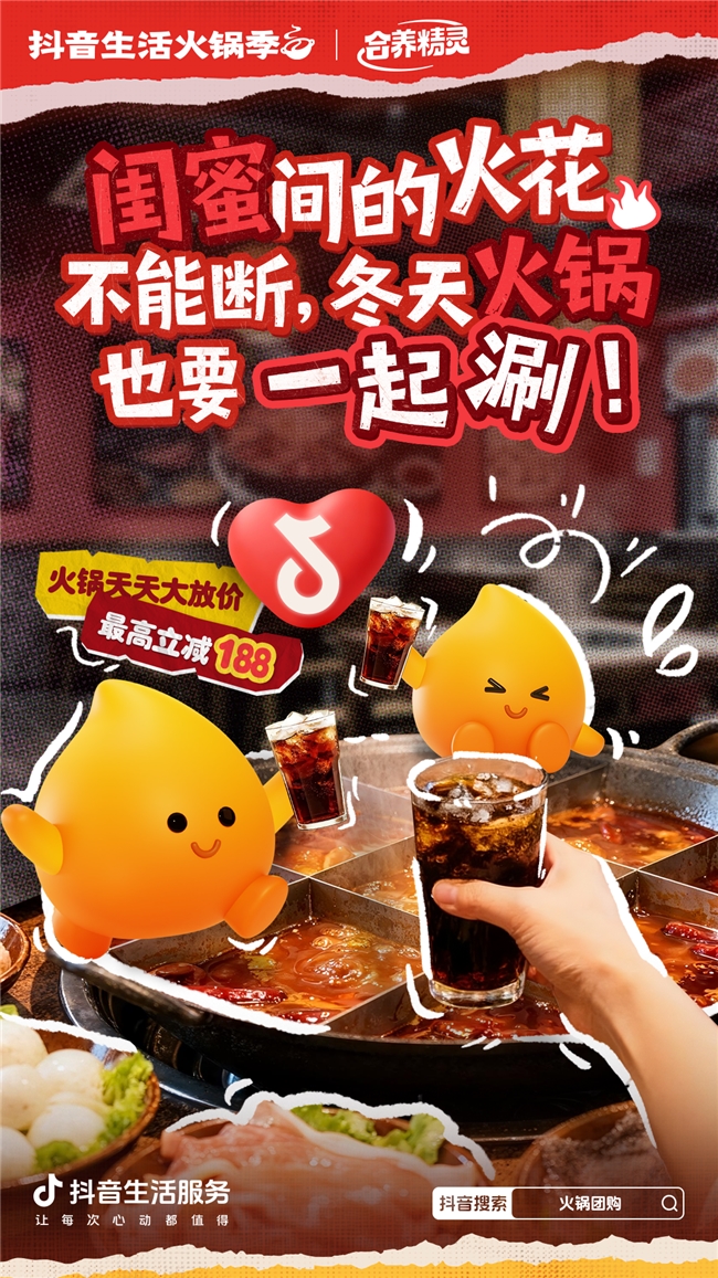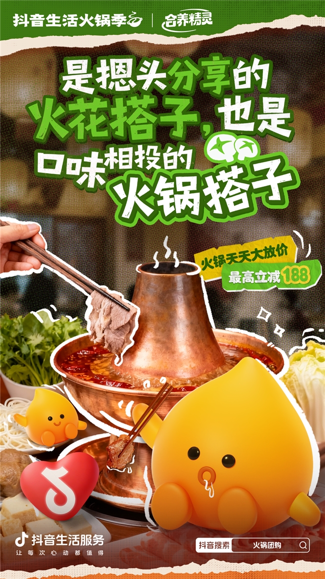 为了让大家吃出“不一样的沸腾”,「抖音生活火锅季」联合中国气象发起“我的火锅天气预报”系列天气食饮科普活动,并携手全国各地气象局一起带大家探索各地的冬日火锅饮食习俗,感受气象文化的奥妙,全面激活大家冬日对火锅的关注。本次活动还联动了抖音「小火人」IP打造熟人社交新玩法,在全网发起“续完火花续火锅”的欢乐邀请。现在上抖音搜索“火锅团购”,即刻畅享火锅天天大放价,最高立减188的超值优惠!赶紧约上你的火锅搭子,一起开启不重样的冬日“沸腾局”吧!