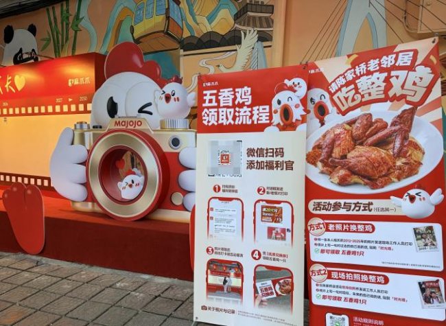 从现场工作人员了解到,这里正在进行一场名为“用一张照片换一只五香鸡”的社区感恩活动,该活动没有复杂的规则,只需提供一张2012年至2025年间的老照片,或现场拍摄一张照片,写下祝福、贴上照片墙,即可免费领取一只五香鸡。